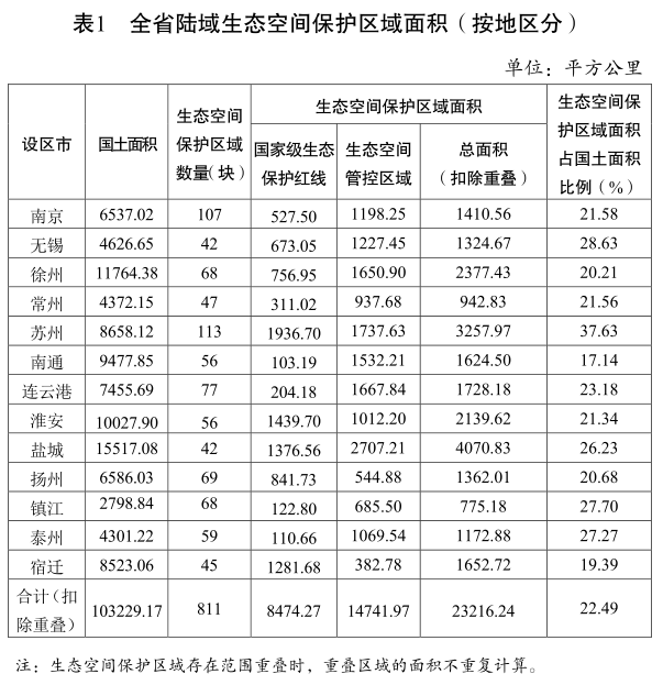 為實現《江蘇省生態紅線區域保護規劃》與《江蘇省國家級生態保護紅線規劃》的有效銜接,確保生態空間適應當前經濟社會發展規劃和生態環境保護實際,在動態優化調整《江蘇省生態紅線區域保護規劃》的基礎上,開展生態空間保護區域的劃定工作。圍繞“功能不降低、面積不減少、性質不改變”的總體目標,最終確定了15大類811塊陸域生態空間保護區域,總面積23216.24平方公里,占全省陸域國土面積的22.49%。其中,國家級生態保護紅線陸域面積為8474.27平方公里,占全省陸域國土面積的8.21%;生態空間管控區域面積為14741.97平方公里,占全省陸域國土面積的14.28%。本規劃中涉及的國家級生態保護紅線內容,將根據生態保護紅線評估結果做好動態完善,管控要求執行國家和省相關規定。
