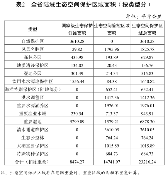 全省陸域共劃定15大類811塊生態空間保護區域,總面積23216.24平方公里,占全省陸域國土面積的22.49%。其中,國家級生態保護紅線陸域面積8474.27平方公里,占全省陸域國土面積的8.21%;生態空間管控區域面積14741.97平方公里,占全省陸域國土面積的14.28%。